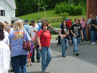 I walk over to the food line…it snakes all around the parking lot…I by pass all the people in the line…walk over to where they are serving the public…check it out…then down the line to see where they are cooking the Ramps, tators, bacon, soup beans (red beans), corn bread, cole slaw, pickles….I need a bib.