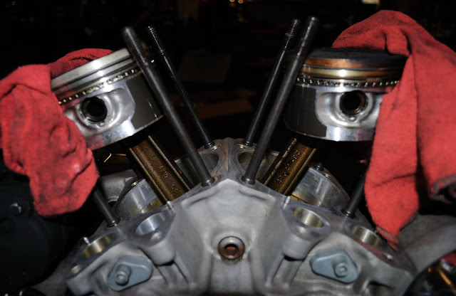 While I was inspecting the rest of the engine, I noticed a spot on the rear cylinder that appeared to have a "huffing" mark on the cases where the cylinder met up with the case. So I asked Shannon to check it out and replace the base gaskets. Yes, I've been there with a blown base gasket before. Shannon pulled the cylinders and he felt there hadn't been a problem there. You know, that's exactly my luck. Had I told him to leave it alone, it would have been a blow out for sure!