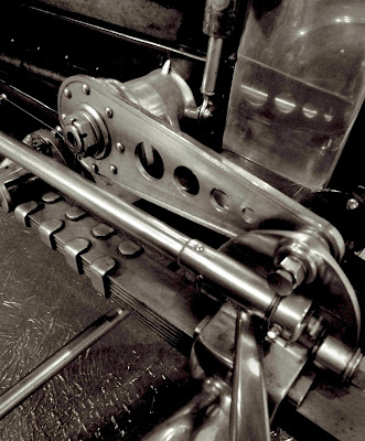 For those whom 1920s sports cars are too new, the Motor Festival included a rare demonstration of a replica of the world’s first automobile, the Cugnot 'Fardier' steam tricycle of 1769. That’s not a typo; we’ve been working at going fast on wheels for 250 years…and as mentioned in a previous post, it technically falls into the motorcycle camp, having 3 wheels... In 1990s parlance, to drive the Cugnot is to be ‘stoked’, as the big steam boiler requires a lot of metal-rod poking to build up a head of steam. And while the steam piston engine is familiar in many respects, the rack-and-gearwheel-and-giant-chain drive is unique. The massive front wheel (and yes, the French invented front wheel drive…180 years before the Citroen TA) also acts as flywheel, and while there is no clutch, a meter-long lever controls the steam pressure and releases forward drive.