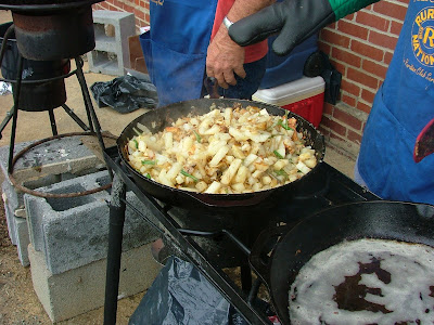 I walk over to the food line…it snakes all around the parking lot…I by pass all the people in the line…walk over to where they are serving the public…check it out…then down the line to see where they are cooking the Ramps, tators, bacon, soup beans (red beans), corn bread, cole slaw, pickles….I need a bib.